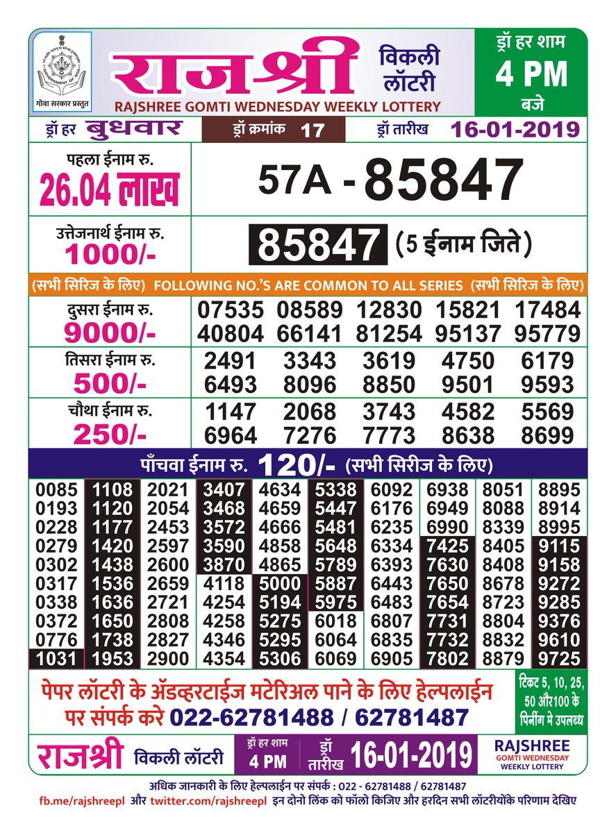 Lottery Result Goa State Rajashree Gomati Day Paper Lottery 16 Jan 2019 - Other required information of rajshree 20 monthly lottery results 2021 regarding lucky numbers, draw.