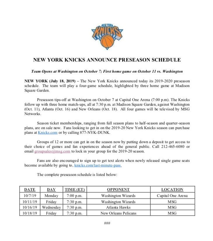 Knicks Preseason Schedule Knicks Preseason Schedule : The complete preseason schedule is listed below: