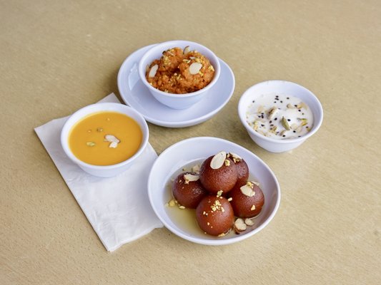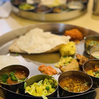 Rajwadi Thali Chaat & Sweets Rajwadi Thali Chaat & Sweets - Round flat crispy wafers topped with potato, sprouts, yogurt, chickpeas and sweet/spicy chutneys sprinkled with sev.